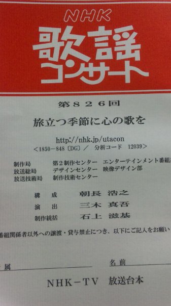 2013年3月19日 / 最終更新日 : 2013年3月19日 kohei-staff ブログ 歌謡コンサート 3回目の歌謡コンサートです。只今リハーサル終わりました。今日のタイトルは「旅立つ季節に心の歌を」です。初のカバー曲を歌います。期待して下さい。皆さ~ん・・・夜8時NHK総合テレビですょ~